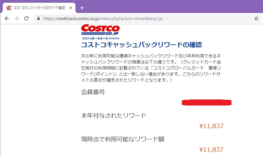 コストコ リワード 確認